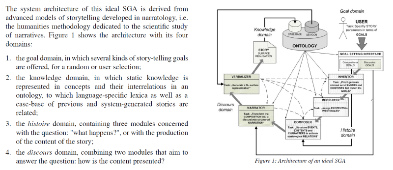 In Zusammenarbeit mit: Rolf D.Krause, Birte Lönneker (bis 6/2009), Stefanie Thiedig (bis 5/2006), Lisa Stremlau ( 5/2006-5/2007), Evelyn Gius (6/2009-12/2009). Gefördert durch die DFG. Dieses Projekt beschäftigte sich mit Möglichkeiten der Nutzung informatikbasierter Modelle und rechnergestützter Verfahren für die Analyse und Modellierung narrativer Funktionen. Dabei wurde die narratologische Relevanz der Theorien und Modelle und deren Implementierung in Programmen zur Erzeugung von Erzählungen – sog. “Story Generators” – untersucht. Durch eine Abbildung von narratologischen und KI-Herangehensweisen aufeinander konnten deren jeweilige Stärken und Schwächen analysiert und Forschungsdesiderata formuliert werden. Ein wesentliches Projektziel war, ein vom narratologischen Standpunkt aus “ideales” Modell kreativer Generierung von Erzählungen zu definieren, wobei Implementierungsaspekte zwar nicht im Vordergrund standen, aber dennoch nicht außer Acht gelassen werden sollten. Dieses Modell haben wir u.a. in dem Aufsatz “Story Generators: Modells and Approaches for the Generation of Literary Artefacts” 1) vorgestellt und diskutiert: