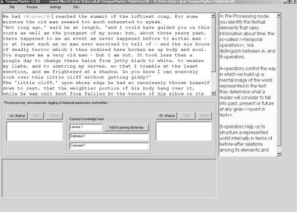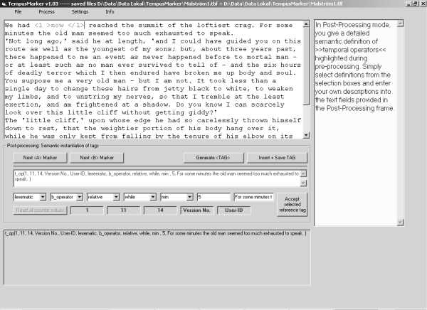 The following series of screenshots gives a brief introduction to the TempusMarker software. Please refer to the user instructions in the right hand text box on the GUI. Note that the below screenshots are based on version 1.0, the current version 1.07 includes further semi-automatic parsing routines and a slightly altered GUI.